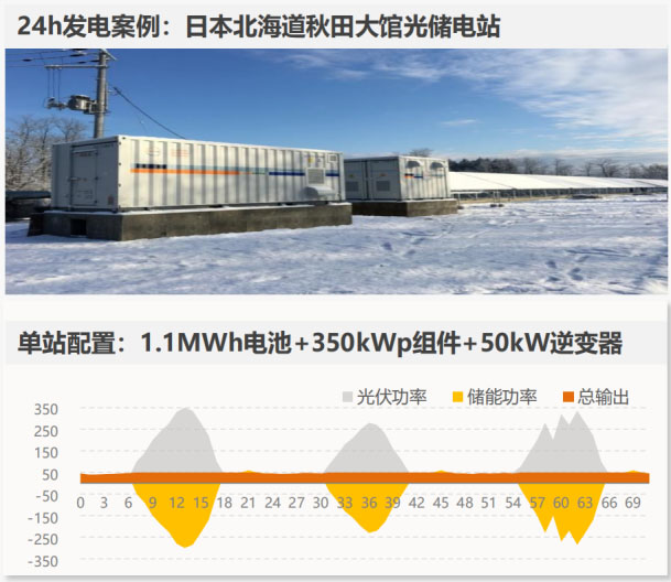 其次,對于大型地面電站來說,光儲融合可實現(xiàn)光伏電站24小時發(fā)電?!肮鈨?4小時發(fā)電并不是一個新的概念,這在海外的分布式電站中已經(jīng)完全實現(xiàn)了,下圖是日本的秋田大館電站,光伏與逆變器按照高容配比進行設計,直流側融合儲能,完全可以實現(xiàn)達到24小時發(fā)電”,張躍火介紹道。