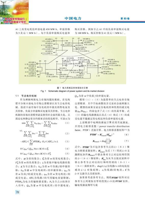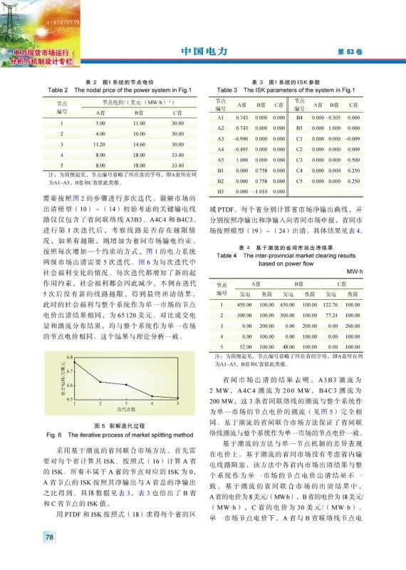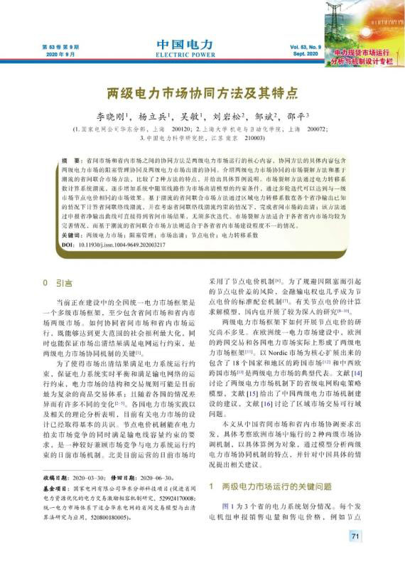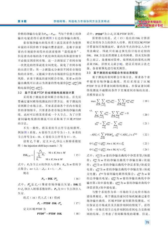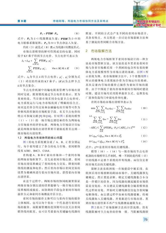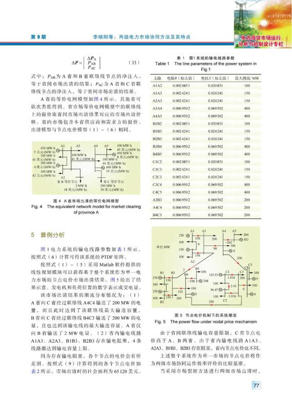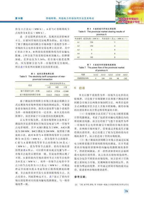 省間市場(chǎng)和省內(nèi)市場(chǎng)之間的協(xié)同方法是兩級(jí)電力市場(chǎng)運(yùn)行的核心內(nèi)容,協(xié)同方法的具體內(nèi)容包含兩級(jí)電力市場(chǎng)的阻塞管理協(xié)同及兩級(jí)電力市場(chǎng)出清的協(xié)同。介紹兩級(jí)電力市場(chǎng)協(xié)同的市場(chǎng)裂解方法和基于潮流的省間聯(lián)合市場(chǎng)方法,比較了2種方法的特點(diǎn),并給出具體算例說(shuō)明。市場(chǎng)裂解方法通過(guò)電力轉(zhuǎn)移系數(shù)計(jì)算系統(tǒng)潮流,逐步增加系統(tǒng)中阻塞線路作為市場(chǎng)出清模型的約束條件,通過(guò)多輪迭代可以達(dá)到與一級(jí)市場(chǎng)節(jié)點(diǎn)電價(jià)相同的市場(chǎng)效果?;诔绷鞯氖¢g聯(lián)合市場(chǎng)方法通過(guò)區(qū)域電力轉(zhuǎn)移系數(shù)在各個(gè)省凈輸出已知的情況下計(jì)算省間聯(lián)絡(luò)線潮流,并在考慮省間聯(lián)絡(luò)線潮流約束的情況下,完成省間市場(chǎng)的出清;該方法通過(guò)申報(bào)省凈輸出曲線可直接得到省間市場(chǎng)結(jié)果,無(wú)須多次迭代。市場(chǎng)裂解方法適合于各省省內(nèi)市場(chǎng)均較為完善情況,而基于潮流的省間聯(lián)合市場(chǎng)方法則適合于各省省內(nèi)市場(chǎng)建設(shè)程度不一的情況。