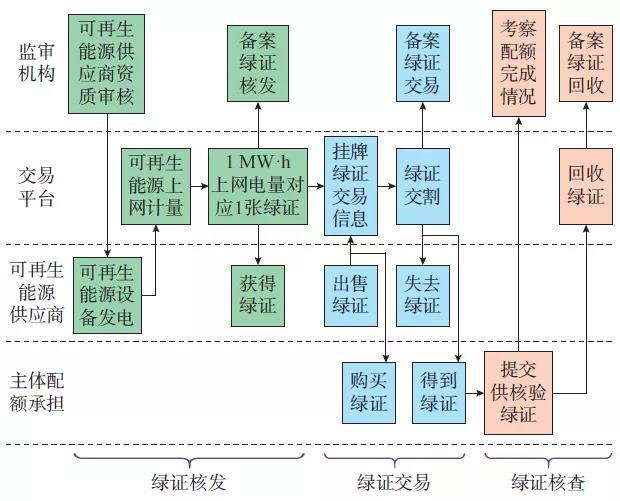 綠證的核發(fā)環(huán)節(jié)與可再生能源發(fā)電電量綁定??稍偕茉磁漕~是綠證市場的流通動力,而綠證則是配額核算的重要依據(jù)。交易過程中,可再生能源發(fā)電商通過出售綠證獲得補貼,履責(zé)主體通過購買綠證完成消納指標。綠證流通不受任何物理約束影響,無需集中出清,應(yīng)由其所有者決定具體的交易對象和交易價格。綠證交易天然是去中心化和分布式的,采用雙邊交易機制。而核查是綠證兌付配額制檢查并退出市場的階段。