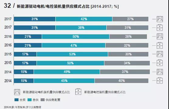 而為了加強對新技術(shù)、新產(chǎn)品的掌控,保證零部件供應(yīng)的安全,越來越多的主機廠在關(guān)鍵部件上開始采用自主研發(fā)或者合作共研的方式,減少投資需求并提升研發(fā)能力。根據(jù)報告統(tǒng)計的數(shù)據(jù),自2014年開始,新能源驅(qū)動電機、電控中,自研自供一直占有不小的比例。而從變化趨勢來看,供應(yīng)商配套的占比在穩(wěn)步下降,自研自供比例雖然也略有下降,但是也轉(zhuǎn)到了合資這一塊。