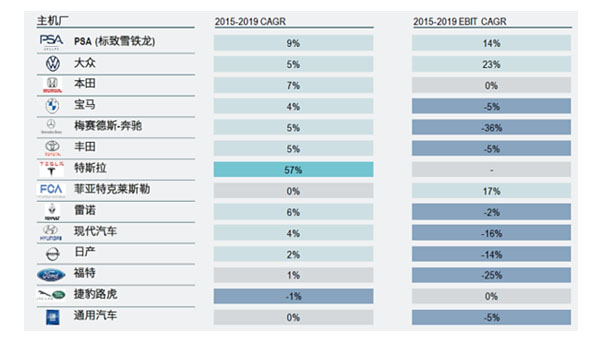 2017年以后,隨著全球各主要輕型車市場進入緩慢增長的“新常態(tài)”,市場紅利逐步消失,存量競爭愈發(fā)白熱化。過去野蠻增長下的高利潤空間也被逐漸壓縮,傳統(tǒng)供應(yīng)鏈增長處在相對乏力的狀態(tài),無論整車廠還是零部件供應(yīng)商,即便在營收增長的情況下,盈利能力在持續(xù)下滑。大多都出現(xiàn)了利潤下降甚至虧損的情況,嚴重者息稅前利潤(EBIT)年降幅超過10%。