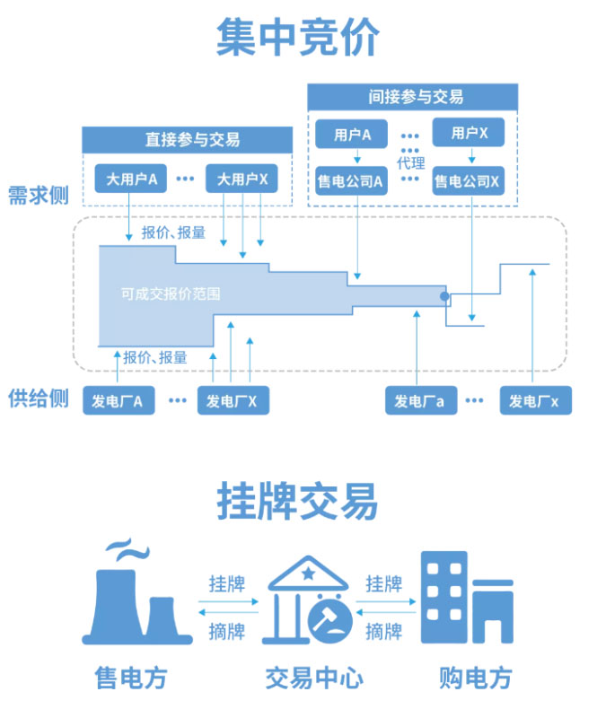 在電力市場(chǎng)中,發(fā)電企業(yè)和電力用戶(或售電公司)間可以通過協(xié)商、競(jìng)價(jià)、掛牌等多種市場(chǎng)化方式開展批發(fā)交易,形成電能量批發(fā)價(jià)格。售電公司和其代理的電力用戶之間可以通過簽訂個(gè)性化的售電合同形成電能量零售價(jià)格。