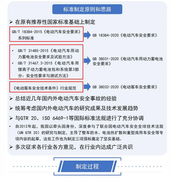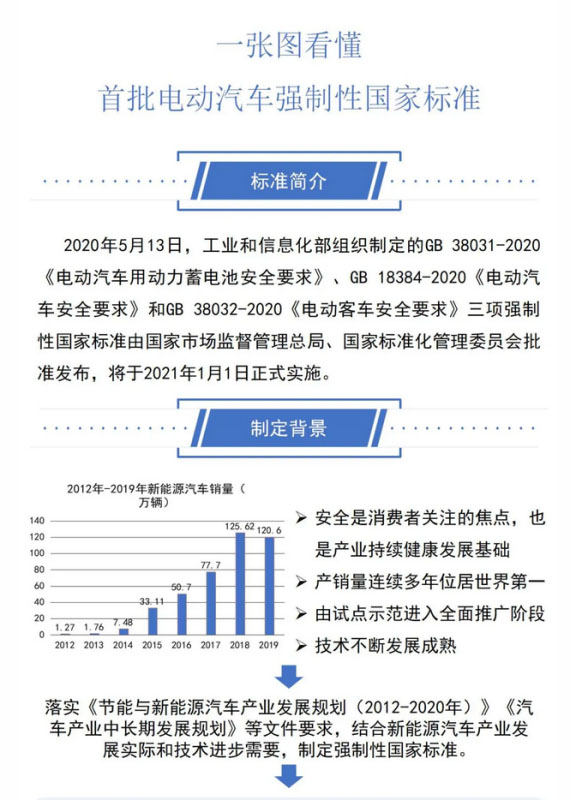 值得一提的是,今年5月,《電動(dòng)汽車安全要求》《電動(dòng)客車安全要求》和《電動(dòng)汽車用動(dòng)力蓄電池安全要求》三項(xiàng)強(qiáng)制性國(guó)家標(biāo)準(zhǔn)批準(zhǔn)發(fā)布,將于2021年1月正式實(shí)施。這是工業(yè)和信息化部根據(jù)國(guó)務(wù)院《節(jié)能與新能源汽車產(chǎn)業(yè)發(fā)展規(guī)劃(2012-2020年)》《汽車產(chǎn)業(yè)中長(zhǎng)期發(fā)展規(guī)劃》要求組織起草、我國(guó)電動(dòng)汽車領(lǐng)域的首批強(qiáng)制性標(biāo)準(zhǔn)。