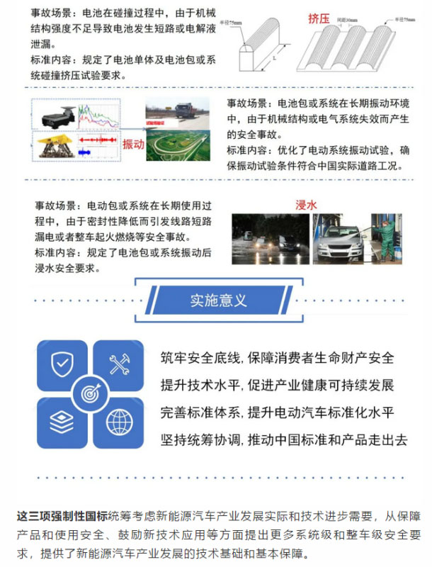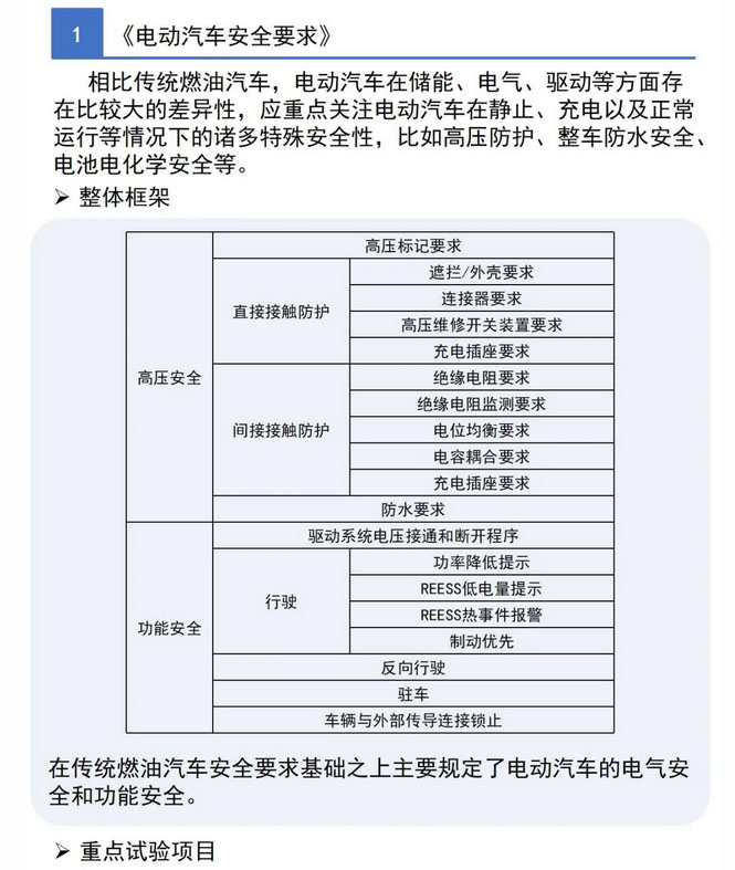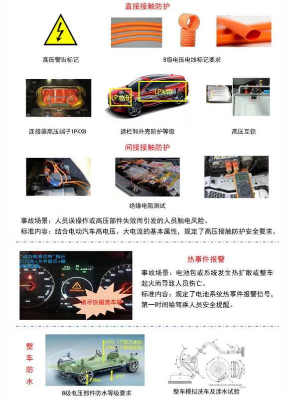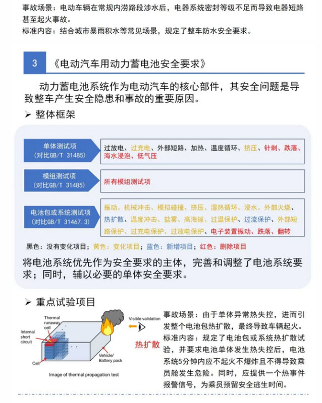 《電動(dòng)汽車安全要求》主要規(guī)定了電動(dòng)汽車的電氣安全和功能安全,重點(diǎn)增加并強(qiáng)化了熱失控報(bào)警和整車防水性能要求,以降低火災(zāi)、遇水等情況下的安全風(fēng)險(xiǎn)。