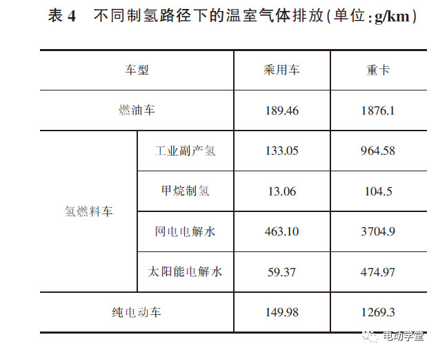 由表可知,就溫室氣體排放而言,不同制氫路徑下,氫燃料電池乘用車與汽油車相比,甲烷制氫可減排93.10%、工業(yè)副產(chǎn)氫可減排30%、網(wǎng)電電解水制氫增加130%的排放;與純電動車相比,工業(yè)副產(chǎn)制氫可減排11%、甲烷制氫可減排91.29%、太陽能電解水制氫可減排60.41%、網(wǎng)電電解水制氫無溫室氣體減排優(yōu)勢。