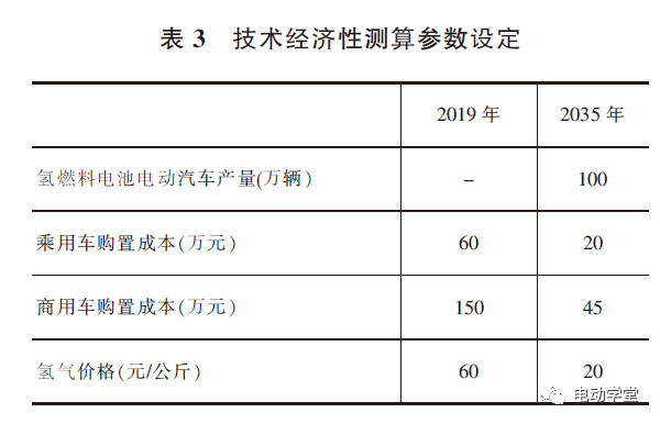 為準(zhǔn)確模擬,本文乘用車選取典型的B級汽油車、續(xù)駛里程300公里的純電動汽車和功率為114千瓦的燃料電池電動汽車作為研究車型;商用車選取同級別的柴油重卡、純電動重卡和燃料電池重卡開展對比分析。燃料電池電動汽車產(chǎn)量、燃料電池系統(tǒng)成本、氫氣價格等關(guān)鍵參數(shù)如表3所示,使用壽命乘用車按15年20萬里、長途重卡按8年60萬公里計算。