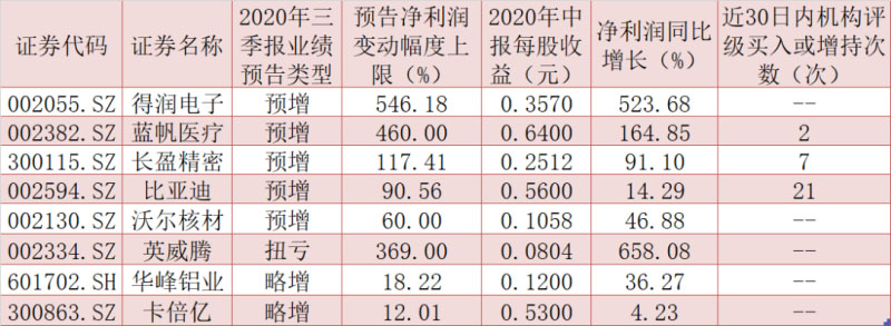 今年三季報(bào)業(yè)績預(yù)告方面,截至目前,有21家相關(guān)上市公司率先披露了2020年三季報(bào)業(yè)績預(yù)告,得潤電子、藍(lán)帆醫(yī)療、長盈精密、比亞迪、沃爾核材、英威騰、華峰鋁業(yè)、卡倍億等8家公司2020年前三季度凈利潤均有望同比增長。