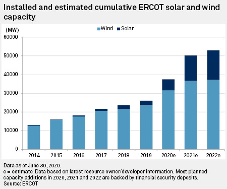 目前,德州的可再生能源買家和供應(yīng)商正充分利用聯(lián)邦投資稅抵免政策,但未來(lái)兩年內(nèi),這項(xiàng)政策將逐步取消。ERCOT最新的項(xiàng)目所有者和開(kāi)發(fā)商清單顯示,到2022年底,風(fēng)能和太陽(yáng)能的總發(fā)電能力有望達(dá)到近53100MW,較2020年初翻了一番還多,目前金融機(jī)構(gòu)的保證金已支付了計(jì)劃新增一半以上的光伏項(xiàng)目(13547MW)。