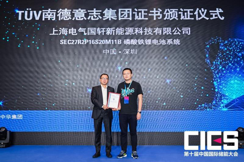上海電氣國軒代表葉飛在頒證儀式上表示:“非常感謝第十屆國際儲能大會提供的平臺和機會,同時也非常感謝TüV南德對我司上海電氣國軒電池PACK的產(chǎn)品嚴格檢測和認可。儲能作為國家戰(zhàn)略性新興產(chǎn)業(yè),是適應能源清潔轉型和促進大規(guī)模新能源消納的關鍵支撐技術,將在未來能源系統(tǒng)中扮演重要角色,隨著技術經(jīng)濟性不斷成熟,儲能產(chǎn)業(yè)發(fā)展引起社會各方高度關注,在電源側、電網(wǎng)側、用戶側的應用重要性日益凸顯。上海電氣國軒從成立之初,一直堅持安全性、可靠性、高效性、經(jīng)濟性、先進性等發(fā)展原則和理念深耕儲能領域,做大做強公司產(chǎn)品和促進儲能行業(yè)發(fā)展。在此,也非常的歡迎TüV南德的領導同事一起前往上海電氣國軒,對我司的產(chǎn)品研發(fā)、設計、系統(tǒng)集成等方面給出寶貴的建議,讓我們一起共同促進和引領儲能行業(yè)發(fā)展?!?