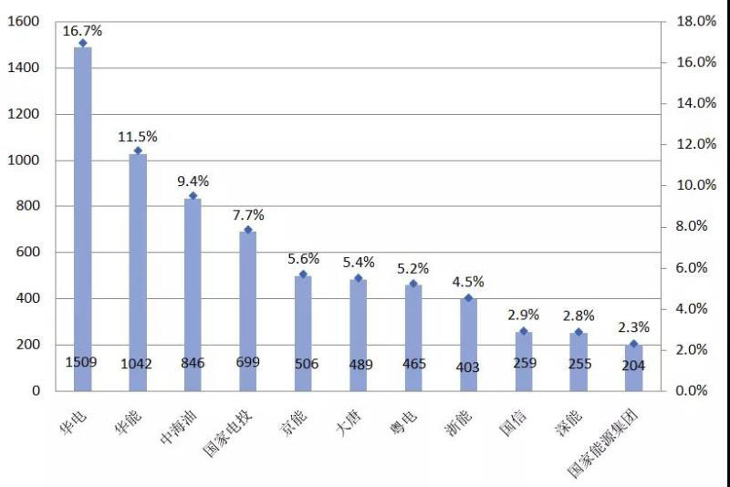 圖4 2019年全國各主要發(fā)電集團氣電裝機情況(單位:萬千瓦,%)