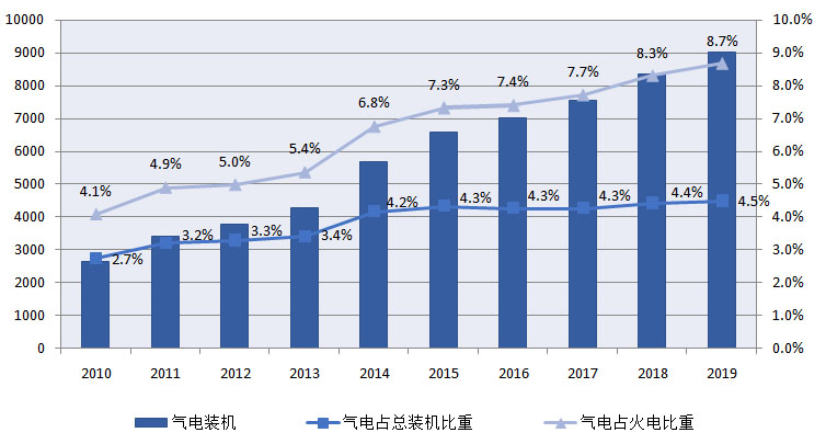 自2010年以來,氣電產(chǎn)業(yè)雖然經(jīng)歷了天然氣供應(yīng)階段性緊張、氣價上揚、電力需求增速放緩等不利因素的影響,但整體仍發(fā)展較快。圖2顯示,氣電裝機容量自2010年至今已增長240%。但由于同期風電、光伏發(fā)電的迅猛發(fā)展,使得氣電在總裝機容量的比重增長并不明顯,特別近5年基本維持在4.3%~4.5%。但氣電在火電裝機的比重卻保持了較為明顯的增長態(tài)勢,由2010年的4.1%增長為2019年的8.7%,表明氣電作為低碳清潔能源在我國能源結(jié)構(gòu)調(diào)整和低碳轉(zhuǎn)型中地位越來越重要。