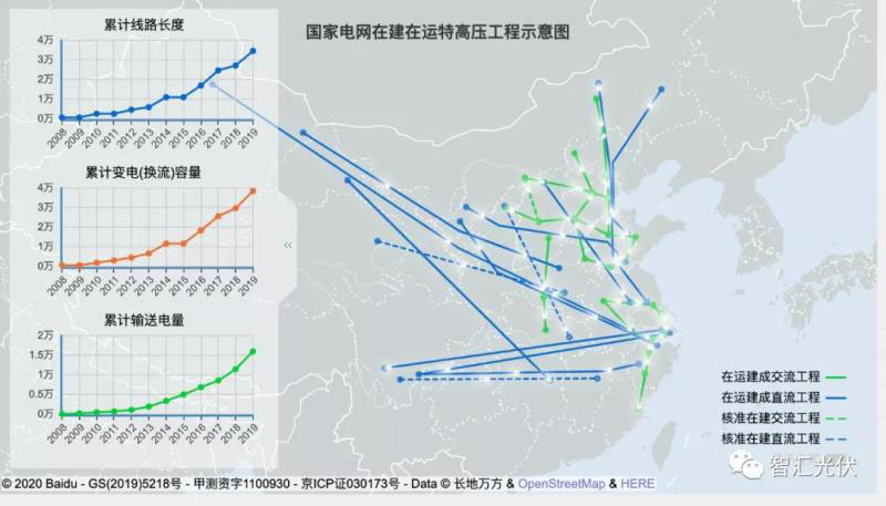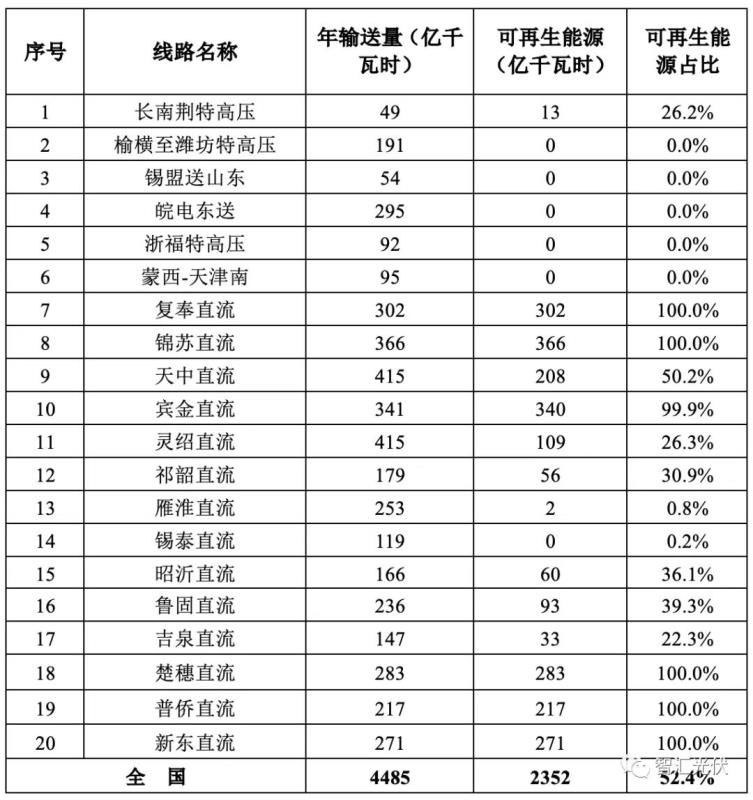 2019年,20條特高壓線路年輸送電量4485億千瓦時,其中可再生能源電量2352億千瓦時,同比提高12.8%,可再生能源電量占全部輸送電量的52.4%。