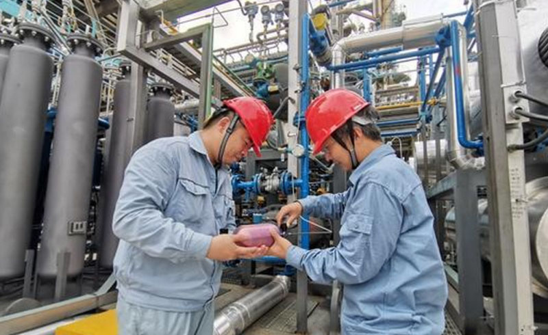 裝置技術人員正在用專業(yè)采樣器采取高純氫樣品。徐崢輝攝