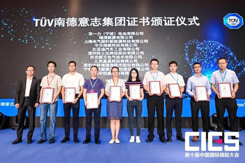 在儲(chǔ)能安全、標(biāo)準(zhǔn)與檢測分會(huì)場上,TüV南德特別為12家儲(chǔ)能企業(yè)現(xiàn)場頒發(fā)了產(chǎn)品認(rèn)證證書。獲頒產(chǎn)品認(rèn)證證書的企業(yè)分別為:雙一力(寧波)電池有限公司,瑞浦能源有限公司,上海電氣國軒新能源科技有限公司,中天儲(chǔ)能科技有限公司,江蘇為恒智能科技有限公司,比亞迪汽車工業(yè)有限公司,深圳科士達(dá)科技股份有限公司,西安新艾電氣技術(shù)有限公司,江西星盈科技有限公司,深圳市科信通信技術(shù)股份有限公司,寧德時(shí)代新能源科技股份有限公司以及科華恒盛股份有限公司。