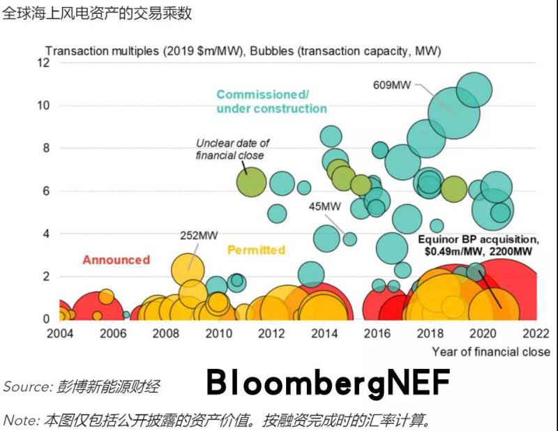 BP以11億美元收購了Equinor美國海上風(fēng)電資產(chǎn)組合的50%股權(quán),其中包括兩個(gè)海上風(fēng)電租約:一個(gè)在麻省,另一個(gè)在紐約州。兩者面積合計(jì)842平方公里,BP聲稱兩個(gè)租賃區(qū)可以容納4.4GW的海上風(fēng)電項(xiàng)目。兩個(gè)租賃區(qū)將按項(xiàng)目劃分,參與各州的海上風(fēng)電競價(jià)。目前兩個(gè)租賃區(qū)尚無獲選容量,所以BP本次收購的資產(chǎn)尚處早期階段,收購交易乘數(shù)與以往處于類似階段的的其他資產(chǎn)組合收購是一致的。