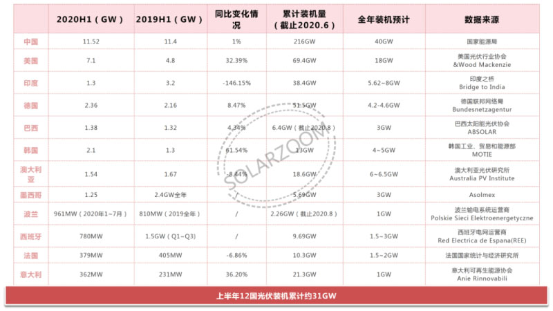 答案是2020年12國上半年光伏裝機累計約31GW,略高于2019年上半年的30GW。