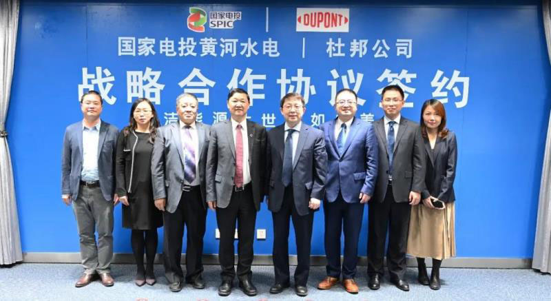 雙方代表親切合影(左四:國家電投黃河公司董事長謝小平;右四:杜邦光伏及氟材料事業(yè)部全球總裁汪偉)