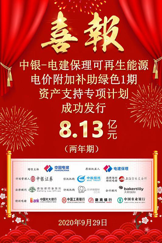 9月29日,電建保理公司成功發(fā)行中銀-電建保理可再生能源電價(jià)附加補(bǔ)助綠色1期資產(chǎn)支持專(zhuān)項(xiàng)計(jì)劃,發(fā)行規(guī)模為8.13億元,期限2年。