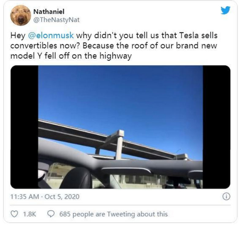 “老伙計,你咋沒告訴我們還有敞篷版的 Model Y 可以選購呢?我家剛買的 Model Y 新車,它的頂棚剛剛在公路上馳騁時被吹飛了!”