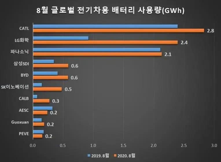 不過,從今年1-8月的整體數(shù)據(jù)來看,LG化學還是以15.9GWh裝機量位居全球榜首,寧德時代則以15.5GWh,屈居第二,排在后面的分別是松下電池、三星SDI、SKI和比亞迪等電池生產企業(yè)。