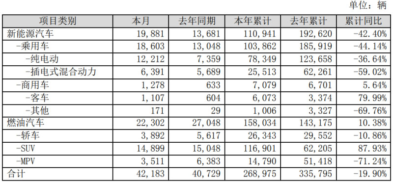 1-9月份,比亞迪汽車合計銷量為26.90萬輛,同比下降19.90%。其中,新能源汽車銷量為11.09萬輛,同比下降42.40%;純電動汽車銷量為7.83萬輛,同比下降36.64%;燃油汽車銷量為15.80萬輛,同比增長10.38%。