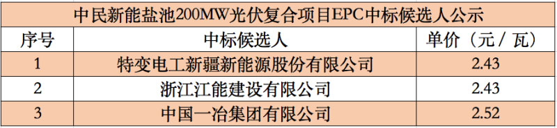 除上述項(xiàng)目外,中民新能鹽池200MW光伏復(fù)合項(xiàng)目EPC也公示了中標(biāo)候選人,特變電工新疆新能源股份有限公司以48603.08萬元投標(biāo)總價(jià),2.43元/瓦的投標(biāo)單價(jià)位列第一中標(biāo)候選人,具體見下: