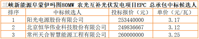 10月10日,三峽新能源阜蒙伊嗎圖80MW農(nóng)光互補(bǔ)光伏發(fā)電項(xiàng)目EPC總承包中標(biāo)候選人公示,陽光電源以25344萬元的投標(biāo)報(bào)價(jià),單價(jià)3.17元/瓦位列第一中標(biāo)候選人。
