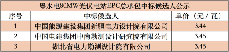 10月7日,中國政府采購網(wǎng)公示了粵水電四個(gè)光伏項(xiàng)目80MW的EPC中標(biāo)候選人,中國能建新疆電力設(shè)計(jì)院以27524.99萬元的總價(jià),3.44元/瓦的單價(jià)位列第一中標(biāo)候選人,同時(shí)也是三個(gè)中標(biāo)候選人當(dāng)中的最低報(bào)價(jià)。具體中標(biāo)情況見下表: