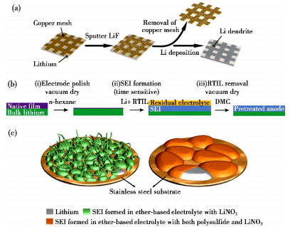 圖3 各種人工SEI膜:(a)氟化鋰作為人工SEI膜改性鋰金屬負極;(b)利用離子液體電解質(zhì)進行化學預處理制備人工SEI膜的過程;(c)加入添加劑改性電解液的鋰沉積形貌示意圖
