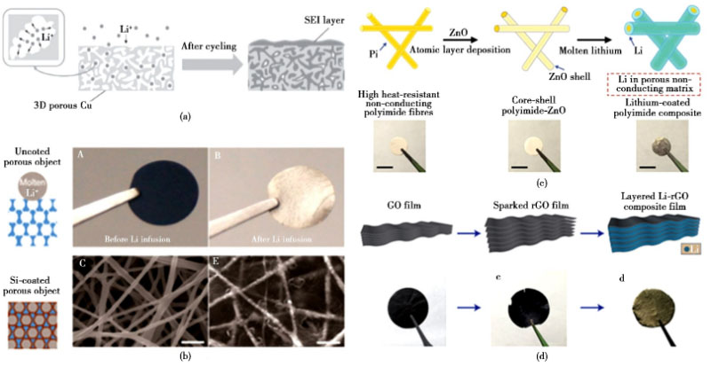 圖2 不同穩(wěn)定Li沉積主體的策略:(a)去合金化制備三維多孔鋰負極集流體;(b)硅包覆的碳納米纖維/鋰復合負極; (c)氧化鋅包覆的碳納米纖維/鋰復合負極;(d)分層還原氧化石墨烯/鋰復合負極