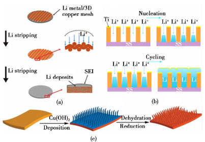 圖1 三種增加鋰的表面積來抑制枝晶生長的策略:(a)三維多孔銅網(wǎng)/鋰復合負極;(b)具有垂直納米通道的聚酰亞胺改性鋰沉積;(c)可容納鋰的亞微米結構銅集流體