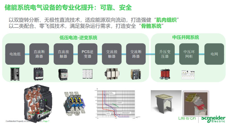 在整個(gè)鏈路上,幾個(gè)環(huán)節(jié)都比較重要。施耐德電氣有很多關(guān)鍵性的技術(shù),保障了設(shè)備的可靠性、以及對(duì)故障響應(yīng)的 及時(shí)性。例如斷路器以雙旋轉(zhuǎn)分?jǐn)?、無(wú)極性直流技術(shù),適應(yīng)能源雙向流動(dòng)裝備。在儲(chǔ)能電站范圍內(nèi),檢修人員操作設(shè)備時(shí),斷路器里如果噴出來帶電氣體,很容易造成人員傷害。從元件的角度,施耐德電氣的框架短路器具有零飛弧技術(shù),實(shí)現(xiàn)了元件本身的安全性,實(shí)現(xiàn)對(duì)運(yùn)維人員的保護(hù)。
