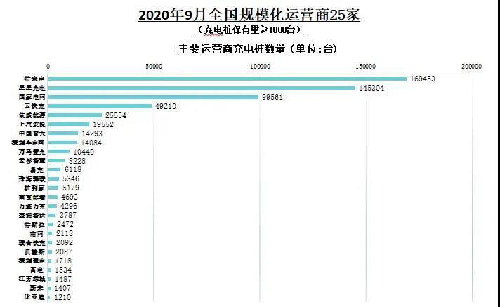 截止到2020年9月,全國充電運營企業(yè)所運營充電樁數(shù)量超過1萬臺的共有9家,分別為:特來電運營16.9萬臺、星星充電運營14.5萬臺、國家電網(wǎng)運營10萬臺、云快充運營4.9萬臺、依威能源運營2.6萬臺、上汽安悅運營2萬臺、中國普天運營1.4萬臺、深圳車電網(wǎng)運營1.4萬臺、萬馬愛充運營1萬臺。這9家運營商占總量的90.3%,其余的運營商占總量的9.7%。