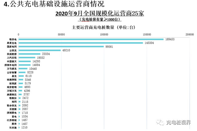 截止到2020年9月,全國充電運(yùn)營企業(yè)所運(yùn)營充電樁數(shù)量超過1萬臺的共有9家,分別為:特來電運(yùn)營16.9萬臺、星星充電運(yùn)營14.5萬臺、國家電網(wǎng)運(yùn)營10萬臺、云快充運(yùn)營4.9萬臺、依威能源運(yùn)營2.6萬臺、上汽安悅運(yùn)營2萬臺、中國普天運(yùn)營1.4萬臺、深圳車電網(wǎng)運(yùn)營1.4萬臺、萬馬愛充運(yùn)營1萬臺。這9家運(yùn)營商占總量的90.3%,其余的運(yùn)營商占總量的9.7%。