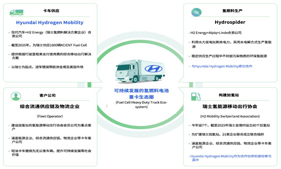 同時,XCIENT Fuel Cell在瑞士將推出全新概念的移動出行服務形態(tài):采用根據(jù)行駛里程來支付使用費(Pay-Per-Use)。該使用費中涵蓋了充電費、維修費、保險費及定期保養(yǎng)費等與車輛行駛相關的各類費用。該服務形態(tài)建立一個全方位的氫能源生態(tài)系統(tǒng),集車輛供應、客戶企業(yè)、加氫站、氫能源生產(chǎn)等4大領域于一體,將卡車的生產(chǎn)、服務和應用場景相結(jié)合,可以在區(qū)域性線路上形成閉環(huán),從而提高卡車運行路線與時間的確定性,使得投資回報變得可以計算。