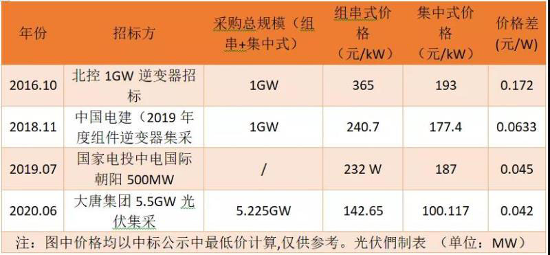如上文所述,從集中式與組串式逆變器的價格來看,二者價差正逐步縮小,尤其是近五年,多次逆變器格局變動和531政策以及海外市場的激烈競爭等因素給逆變器的價格競爭帶來了持續(xù)的壓力。光伏們對比了2012-2020年的重點招標項目,其中對中標候選人或者中標公示人的逆變器價格進行了對比,可以發(fā)現(xiàn),集中式與組串式逆變器的價差正由2016年的0.17元/瓦逐漸縮小至不足5分錢。