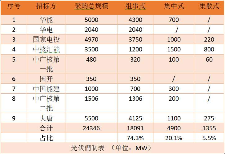 光伏們統(tǒng)計了2020年上半年的電力央企招標,在共計24.3GW的招標中,組串式容量超過了18GW,占總招標容量的74.3%。