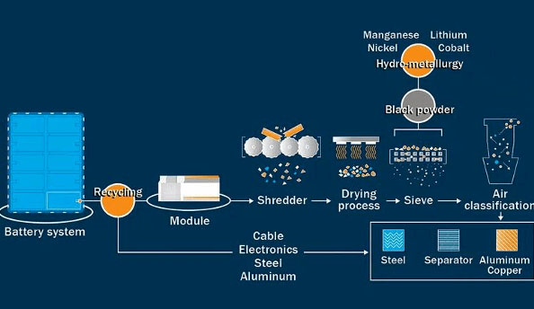 回收動(dòng)力電池主要是回收鋰、鈷、鎳、錳等稀有金屬,這是因?yàn)閯?dòng)力電池近一半的成本都是源于此。