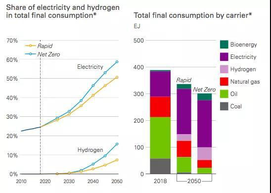 左圖:電能和氫能在終端能源消費中的比重預(yù)測