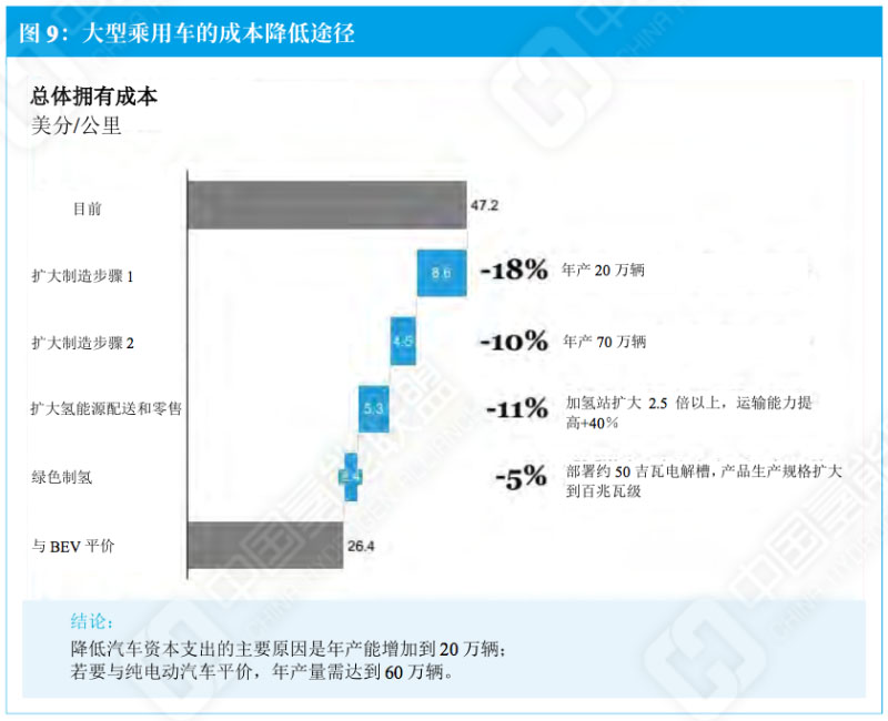 目前階段,氫燃料電池汽車用車成本仍居高不下。據(jù)測算,純電動汽車百公里電費約為6元~15元,燃油車百公里油費約為50元,而氫燃料電池車燃料費用高達(dá)100元。成本問題是制約燃料電池汽車行業(yè)發(fā)展的關(guān)鍵因素。如何才能降成本?根據(jù)國際氫能協(xié)會發(fā)布的《氫能平價之路》,到2030年大型乘用車的總體擁有成本可能下降45%,主要來自于擴(kuò)大產(chǎn)量帶來的規(guī)模效應(yīng)、增加加氫站降低的運輸成本、使用可再生能源降低的制氫成本。