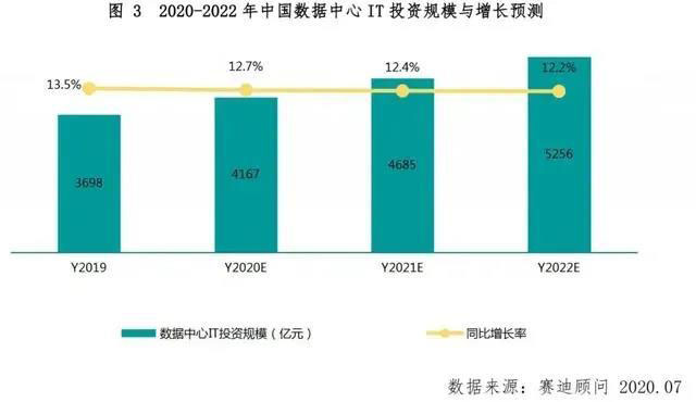 在云計算、5G、區(qū)塊鏈等技術發(fā)展以及智慧城市、數(shù)字經(jīng)濟等應用快速發(fā)展的背景下,對數(shù)據(jù)中心的需求不斷增長。據(jù)賽迪顧問統(tǒng)計,2019年數(shù)據(jù)中心IT投資規(guī)模達到3698億元,比2018年同期增長13.5%。2020年上半年,在全國奮力抗擊新冠肺炎疫情的背景下,線上經(jīng)濟加速繁榮,一時間電子商務、在線問診、遠程辦公、網(wǎng)絡直播、網(wǎng)絡游戲等業(yè)務需求以及業(yè)務規(guī)模不斷上升,金融、制造等行業(yè)也加快信息化進程,這也為IT/CT設備、數(shù)據(jù)中心建設以及下游IDC服務市場等提供了更大的發(fā)展空間。與此同時,新基建的提出將加速以5G、工業(yè)互聯(lián)網(wǎng)、人工智能等為代表的數(shù)字技術融合發(fā)展,進一步帶動行業(yè)數(shù)字化轉型以及數(shù)據(jù)量大幅增長。賽迪顧問預測,到2022年,數(shù)據(jù)中心IT投資規(guī)模將達到5256億元,未來三年將保持12.4%的年均復合增長率。