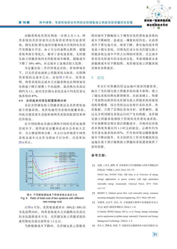 結(jié)論:本文針對青藏高原邊遠(yuǎn)地區(qū)清潔用能需求,提出了光伏儲氫獨(dú)立供能系統(tǒng)的基本架構(gòu),建立了儲氫系統(tǒng)的熱電聯(lián)供模型。在此基礎(chǔ)上,構(gòu)建了考慮熱電聯(lián)供的光伏儲氫獨(dú)立供能系統(tǒng)容量優(yōu)化配置模型。結(jié)合青海邊遠(yuǎn)農(nóng)牧區(qū)實(shí)際光伏、負(fù)荷數(shù)據(jù),開展了算例仿真和分析。結(jié)果表明,通過充分利用儲氫系統(tǒng)運(yùn)行時產(chǎn)生的熱能,光伏儲氫獨(dú)立供能系統(tǒng)相較于傳統(tǒng)的光伏蓄電池系統(tǒng),可有效降低農(nóng)牧區(qū)清潔供能成本。其相對經(jīng)濟(jì)效益在熱電負(fù)荷比約1.3時達(dá)到最佳,總成本約為光伏蓄電池系統(tǒng)的87%,并且相對效益隨新能源成本下降而提升。本文的研究工作對青藏高原邊遠(yuǎn)地區(qū)基于清潔能源獨(dú)立供能的系統(tǒng)建設(shè)提供了新的思路。