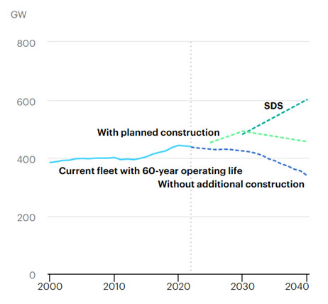 按照目前計劃的建設(shè)趨勢,全球核電裝機將在2030年后呈現(xiàn)下降態(tài)勢,2040年的裝機僅為456吉瓦,遠低于IEA的SDS設(shè)定目標601吉瓦。IEA指出,2020~2040年,核電裝機年均增加15吉瓦,才能達到SDS水平。