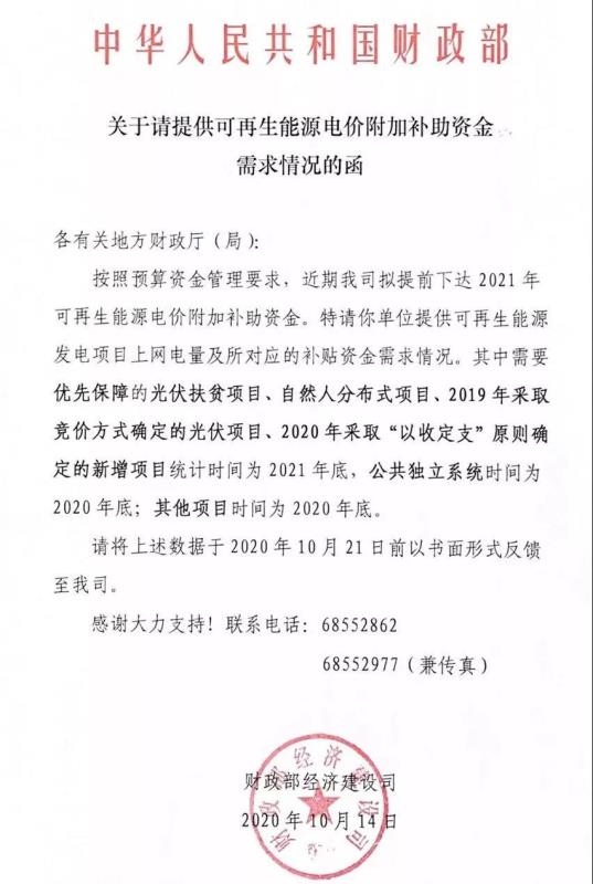 10月14日,財(cái)政部發(fā)文《關(guān)于請?zhí)峁┛稍偕茉措妰r(jià)附加補(bǔ)助資金需求情況的函》,稱近期擬提前下達(dá)2021年可再生能源電價(jià)附加補(bǔ)助資金,要求各地財(cái)政廳(局)提供可再生能源發(fā)電項(xiàng)目上網(wǎng)電量及所對應(yīng)的補(bǔ)貼資金需求。