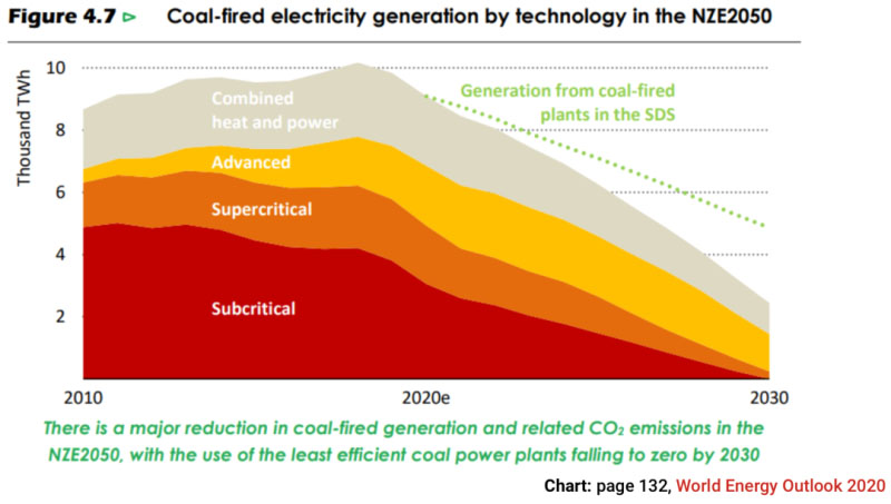 在這個情景下,效率低下的“亞臨界”燃煤發(fā)電廠需要在2030年前完全淘汰,以使世界在2050年之前走上零排放的道路。