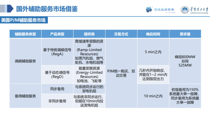 美國PJM電力市場的輔助服務(wù)包括調(diào)頻、備用、黑啟動、無功電壓控制、不平衡電量等。其中最典型的是調(diào)頻和備用。調(diào)頻有幾種,一是基于傳統(tǒng)調(diào)頻信號的調(diào)頻,二是基于動態(tài)調(diào)頻信號的調(diào)頻,傳統(tǒng)調(diào)頻針對爬坡速率受限的傳統(tǒng)發(fā)電機組,儲能屬于基于動態(tài)調(diào)頻信號。備用輔助服務(wù)分同步和非同步。美國PJM輔助服務(wù)市場和實時市場存在時序配合,從實際運行的60分鐘前、30分鐘前、10分鐘前一直到實際運行時間,有一個不同時間尺度的協(xié)調(diào)的程。