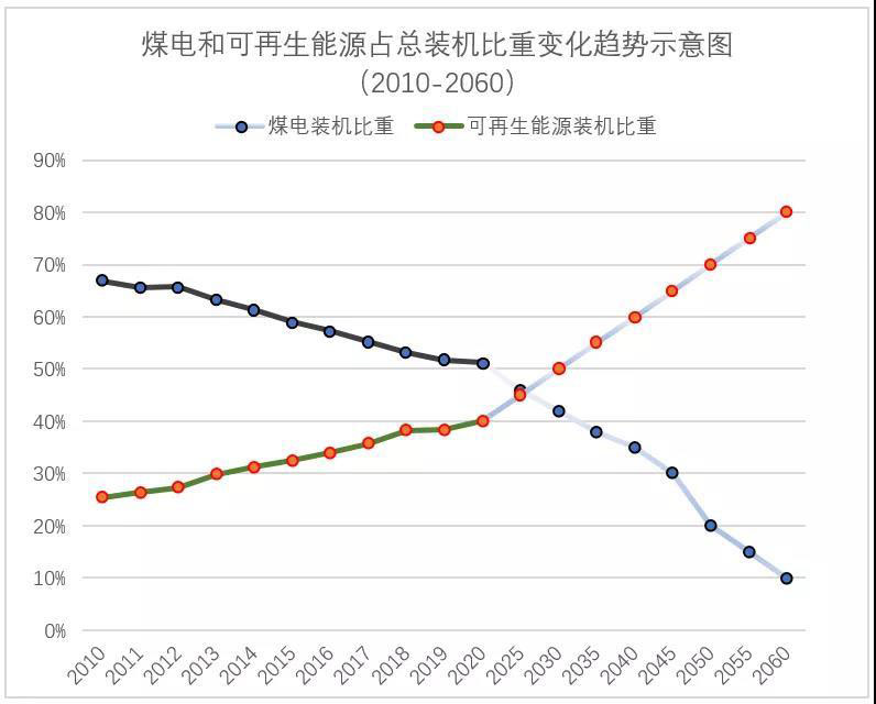 因此,即便在“十四五”期間還無(wú)法做到不上新建煤電項(xiàng)目,但是2060年碳中和目標(biāo)的宣布,已經(jīng)表明煤電裝機(jī)快速的快速增長(zhǎng)時(shí)代的確是“一去不復(fù)返”了,煤電在電力總裝機(jī)的比重目前已經(jīng)接近50%(2019年52%)的情況下,未來(lái)40年每年平均下降至少在1個(gè)百分點(diǎn),才能確保在2060年把煤電裝機(jī)比重控制在10%以下(而且這部分保留的煤電裝機(jī)必須通過(guò)靈活性改造具備調(diào)節(jié)能力),煤電退出后的空間逐步讓位給可再生能源發(fā)電,使得2060年可再生能源發(fā)電裝機(jī)比重至少達(dá)到80%以上,才可能實(shí)現(xiàn)電力的真正低碳化甚至零碳化,確保2060年碳中和目標(biāo)的實(shí)現(xiàn)。
