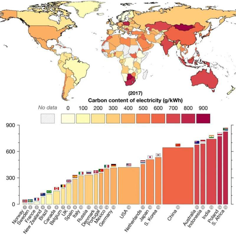 目前,全球主要國(guó)家的供電碳排放從低到高大致分成幾個(gè)類型:1、近零排放國(guó)家(100克以下):挪威、瑞典、瑞士、法國(guó)等;2、超低排放國(guó)家(100克到200克之間):新西蘭、加拿大、奧地利、芬蘭、丹麥、比利時(shí)等;3、低排放國(guó)家(200克到300克之間):英國(guó)、匈牙利、西班牙、葡萄牙、意大利等;4、中排放國(guó)家(300克到500克之間):德國(guó)、荷蘭、智利、美國(guó)、捷克、土耳其、墨西哥、以色列、日本等;5、高排放國(guó)家(500克以上):韓國(guó)、希臘、愛(ài)沙尼亞、中國(guó)、印度、波蘭、澳大利亞、南非等。