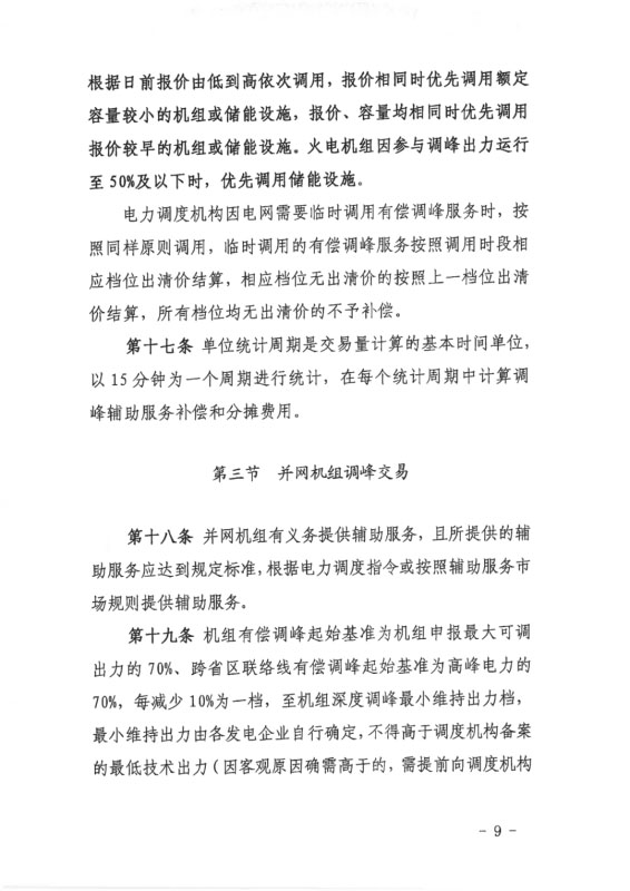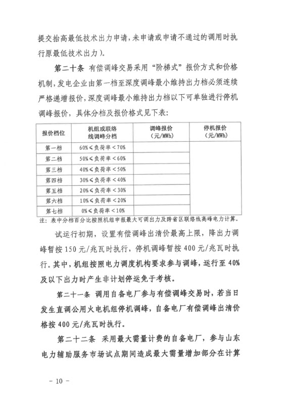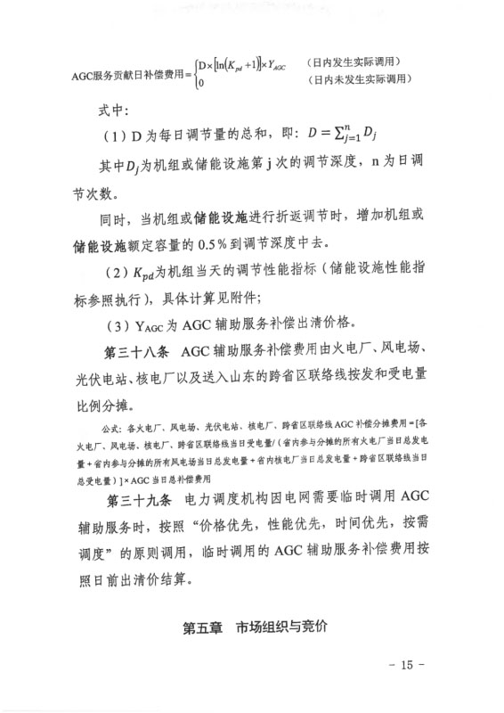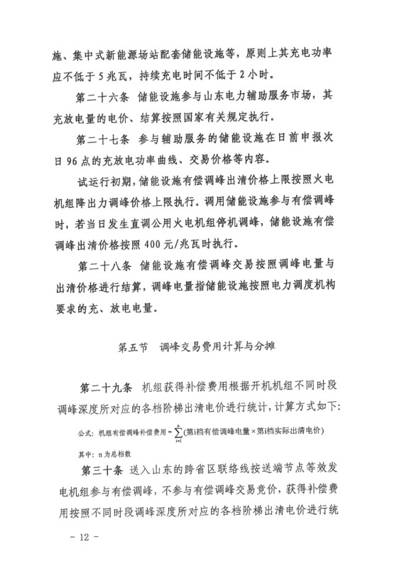 儲(chǔ)能設(shè)施參與山東電力輔助服務(wù)市場(chǎng),其充放電量的電價(jià)、結(jié)算按照國(guó)家有關(guān)規(guī)定執(zhí)行。調(diào)用儲(chǔ)能設(shè)施參與有償調(diào)峰時(shí),若當(dāng)日發(fā)生直調(diào)公用火電機(jī)組停機(jī)調(diào)峰,儲(chǔ)能設(shè)施有償調(diào)峰出清價(jià)格按照400元/MWh執(zhí)行。儲(chǔ)能設(shè)施有償調(diào)峰輔助服務(wù)補(bǔ)償費(fèi)用由風(fēng)電場(chǎng)、光伏電站、核電廠等按場(chǎng)站共同分?jǐn)偂S袃斦{(diào)峰交易機(jī)組調(diào)用時(shí),火電機(jī)組因參與調(diào)峰出力運(yùn)行至50%及以下時(shí),優(yōu)先調(diào)用儲(chǔ)能設(shè)施。