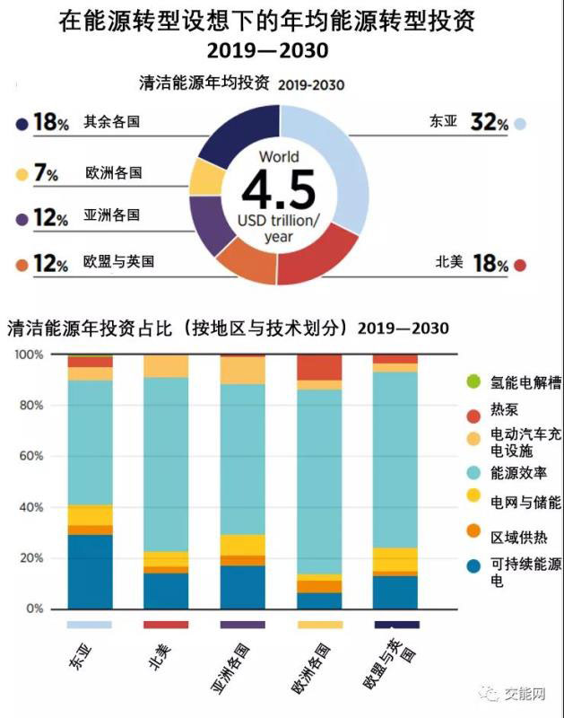 對(duì)能源轉(zhuǎn)型的投資是復(fù)蘇一攬子計(jì)劃中一個(gè)重要的部分。使得在未來(lái)三年及以后提振經(jīng)濟(jì)的同時(shí),在廣泛的職業(yè)中創(chuàng)造就業(yè)機(jī)會(huì)。"能源轉(zhuǎn)型設(shè)想"指出,從現(xiàn)在起到2030年,能源部門(mén)在可再生能源和能源效率方面累計(jì)投資必須上升到49萬(wàn)億美元。因此意味著到2030年,在可再生能源、能源效率和低碳促進(jìn)技術(shù)方面每年的投資約為4.5萬(wàn)億美元,包括電網(wǎng)和存儲(chǔ)等基礎(chǔ)設(shè)施。這一數(shù)字是2019年可再生能源技術(shù)、能源效率和電網(wǎng)(包括存儲(chǔ)系統(tǒng))投資8250億美元的5倍以上。這將意味著投資需求的數(shù)量和投資需求類(lèi)型的改變,因?yàn)閷?duì)能源過(guò)渡的投資,使基礎(chǔ)設(shè)施和能源效率增加,而礦物燃料供應(yīng)的投資減少。